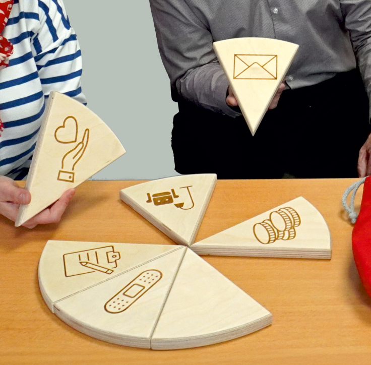 Unsere Betreuungs·pizza aus Holz soll alle Menschen unterstützen, das System der Rechtlichen Betreuung besser zu verstehen. Die Pizzastücke machen mit Piktogrammen die verschiedenen Bereiche einer Rechtlichen Betreuung be-greifbar. Wichtige Botschaft: Von einer Rechtlichen Betreuung ist nie das ganze Leben betroffen – immer nur einzelne Bereiche. Und diese Bereiche können sich jederzeit ändern. Für jeden Menschen mit einer Rechtlichen Betreuung sieht der Pizzabelag also anders aus.
