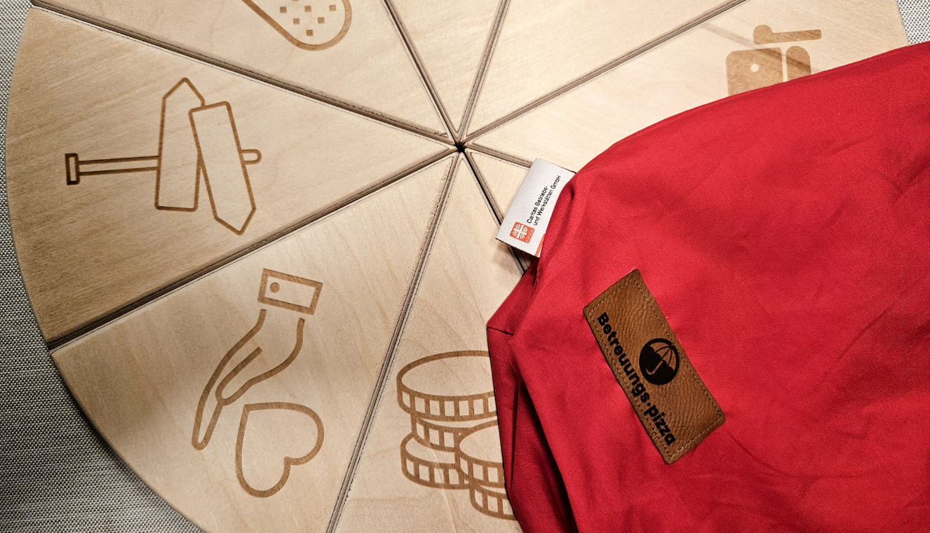 Hergestellt wird die Betreuungs·pizza in der CBW – Caritas Betriebs- und Werkstätten GmbH in Eschweiler-Weisweiler. Das ist ein integrativer Betrieb, in dem viele Menschen mit Handicap arbeiten. Die Menschen vor Ort haben aktiv an der Betreuungs·pizza mitgearbeitet: Sie haben Materialien und Piktogramme getestet und den Aufbewahrungsbeutel gestaltet. Ein beiliegendes Booklet erklärt die Bedeutung der einzelnen Pizzastücke und gibt sprachliche Hinweise für ihren Einsatz in Einfacher Sprache. Wir sind stolz auf diese wunderbare Zusammenarbeit und haben selbst viel gelernt.